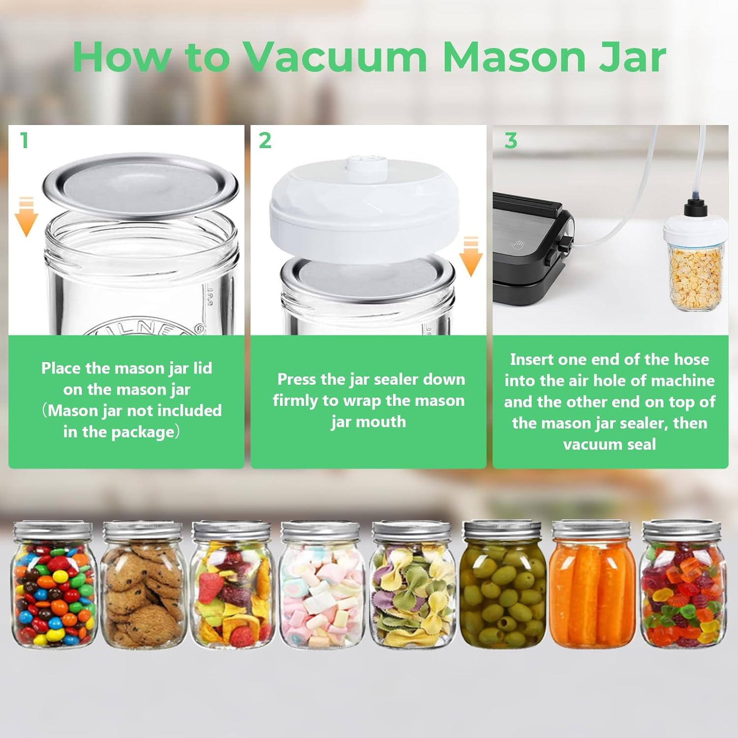 - šššš¬šØš§ ššš« šššš®š®š¦ šššš„šš« šš¢š: This machine could also vacuum Mason jars. Don't bother to buy a Electric Mason vacuum sealer. With 1 Mason jar lid for regular mouth, 1 lid for wider mouth. 1 Manson Jar sealer for regular mouth, 1 jar sealer for wider mouth. And 1 air suction hose for External Vacuum- for Mason jars/canisters. Attachments are compatible with most Mason jars. Note: Electric Mason vacuum sealer is not included, Mason jars are not included.
