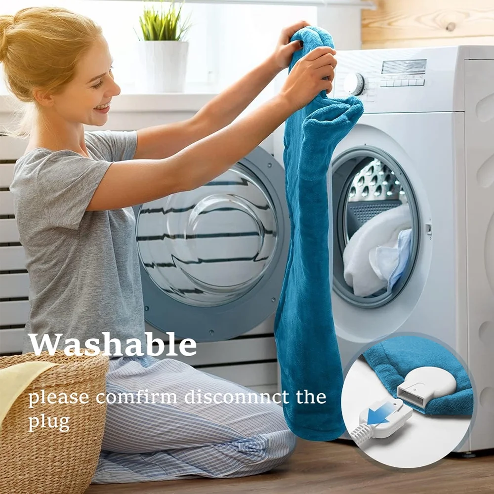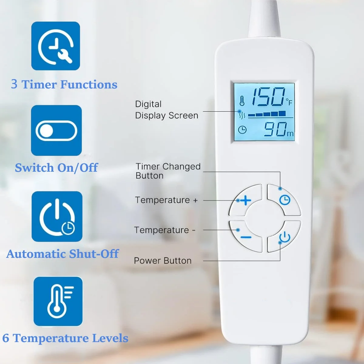 This electric heating pad supports rapid heating and features 6 heating modes with an adjustable temperature range of 100°F to 150°F, which can relieve muscle tension and stiffness caused by cold. It is equipped with a 30/60/90-minute timed automatic shutdown function to ensure safe and controllable use. It adopts a large size design of 24×33 inches, which can cover the back, neck and shoulders. It is made of super soft flannel, and the fine long pile provides high comfort. Supports cold water hand washing or machine washing, making cleaning and maintenance convenient. When in use, please note: Do not knead, sit on or squeeze the pad. Avoid sharp creases to prevent short circuits and burns. The product comes with a heating pad, a power cord with a controller and a user manual.