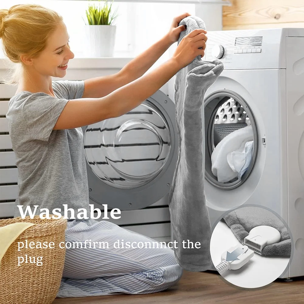 This electric heating pad supports rapid heating and features 6 heating modes with an adjustable temperature range of 100°F to 150°F, which can relieve muscle tension and stiffness caused by cold. It is equipped with a 30/60/90-minute timed automatic shutdown function to ensure safe and controllable use. It adopts a large size design of 24×33 inches, which can cover the back, neck and shoulders. It is made of super soft flannel, and the fine long pile provides high comfort. Supports cold water hand washing or machine washing, making cleaning and maintenance convenient. When in use, please note: Do not knead, sit on or squeeze the pad. Avoid sharp creases to prevent short circuits and burns. The product comes with a heating pad, a power cord with a controller and a user manual.