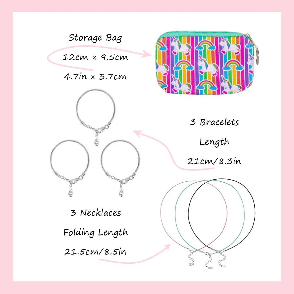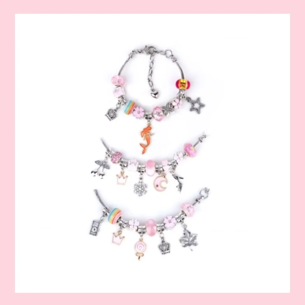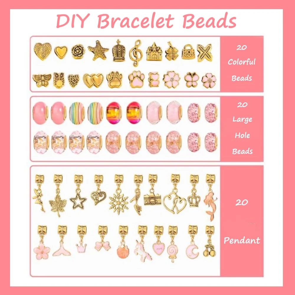 It's a perfect gift choice for girls and kids. It's not only a bracelet toy set, but also a fun jewelry-making skills learning kit. It's super easy to play with full-illustrated instructions. Spark your imagination and time to get creative! Happy is the most valuable thing. So much pink stuff: pink beads, pink charms, pink pendants, pink necklaces, and a pink box. These are the favorites of little girls! Charm Bracelet Kit Cotains 3 bracelet chains, 20 color charm beads, 20 charm metal beads, 20 charm pendant beads, and 3 string necklaces.