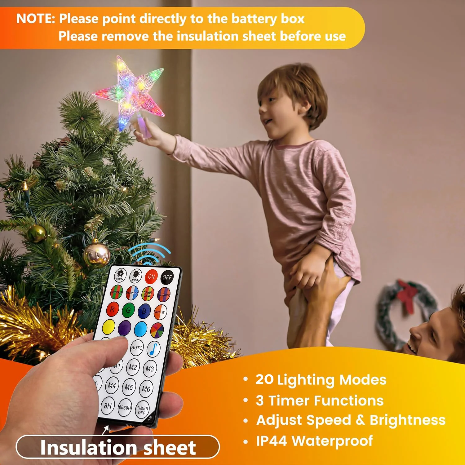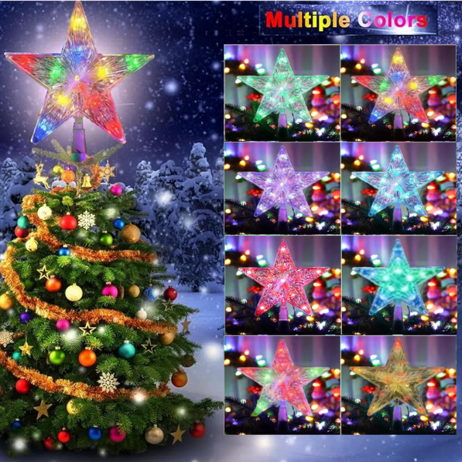 Elevate your holiday ambiance with our exquisite Christmas Tree Topper Light, a perfect blend of elegance and versatility. Designed to cast a soft and enchanting radiance, this stunning star-shaped topper enhances both indoor and outdoor Christmas trees, while also adding a magical touch to bedrooms, weddings, celebrations, and cozy nighttime settings. Its advanced LED technology offers 16 vibrant solid colors and a spectrum of dynamic mixed shades, with multiple modes including steady glow and twinkling effects—all easily customizable via the included remote. Installation is effortless thanks to the universal PVC conical base, fitting most small to medium trees seamlessly. Beyond the tree, it beautifully illuminates bookshelves, windowsills, fireplaces, bars, or offices, making it a year-round decorative asset. With convenient timer settings, water-resistant construction, and a captivating five-point star design that sparkles with festive charm, this tree topper is not just a decoration—it’s an unforgettable experience and a heartwarming gift for loved ones. Package included: 1 x Christmas Star Tree Topper, 1 x Remote Controller, 1 x User Manual.