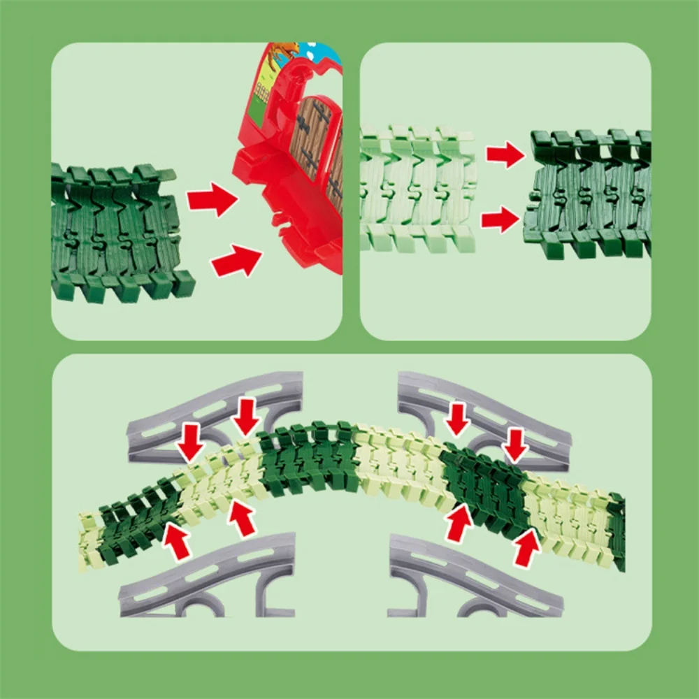 Our dinosaur race car track sets has the function of early childhood education. Very suitable parent-child education. This set comes with 1 battery powered race cars, over 181 track pieces with modular connections, 8 dinosaur toys. The dinosaur toy helps enhance kids construction skills, hand and eye coordination ability while free kids fly their imagination and make happy hours more enjoyable. The product package includes 1 x Off-road vehicle, 6 x PVC small dinosaurs, 2 x PVC large dinosaur, 2 x Three-way intersection, 1 x Door, 4 x Bridge Accessories, 9 x Tree Accessories, 11 x Traffic signs, 181 x Track accessories.