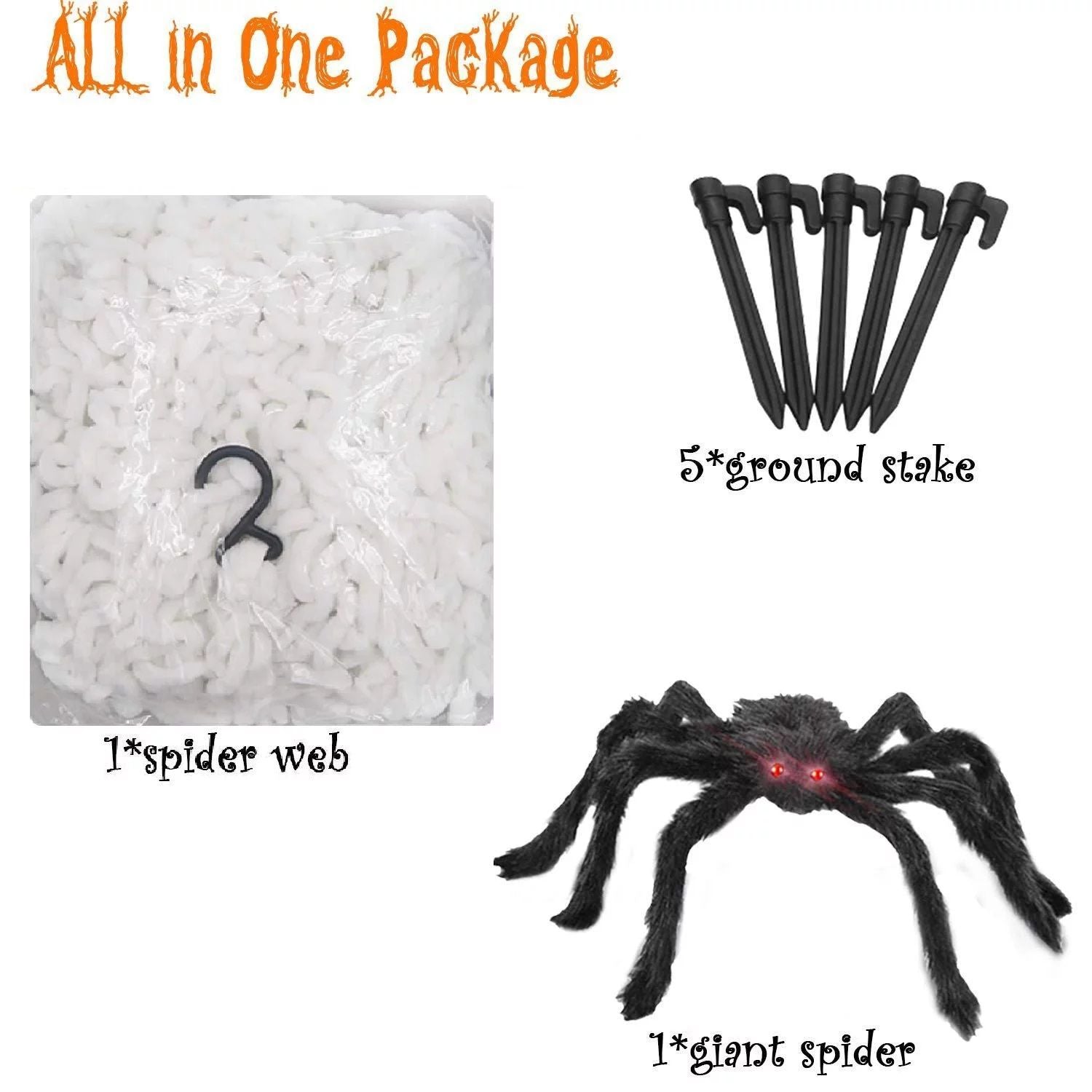 Come with 78.7"" Triangular giant spider web and 16.4' Halloween spider, huge size make it looks real from far away, great addition for around the house. Lightweight white spider web with hooks, very strong and durable, easy to attach to walls, front porches and lawns to survive extreme weather.Package Includes:1× Spider,1× Spider Web,1× Hook 5×Ground nail.