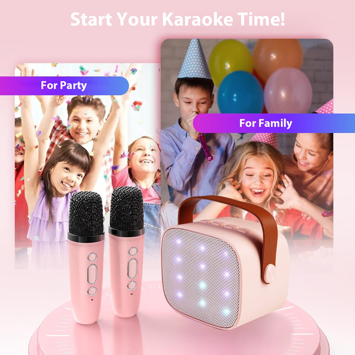 Kids Karaoke Machine with 2 Wireless Microphones – Portable Bluetooth Speaker for Singing & Play – Gift for Girls & Boys Ages 3-12 (Pink)